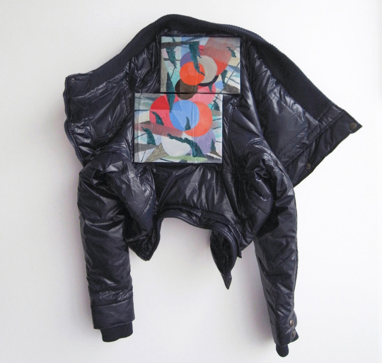 Simon Bergala, Twisted Way (Hollywood Juniper), oil on Moncler, 2012. En peignant sur des supports fonctionnels débordant du chassis, Simon Bergala opère des déplacements dans l’espace pictural. Ce grand mouvement de décontextualisation et de recontextualisation voit émerger de nouvelles réflexions sur la peinture et permet ainsi son évolution.